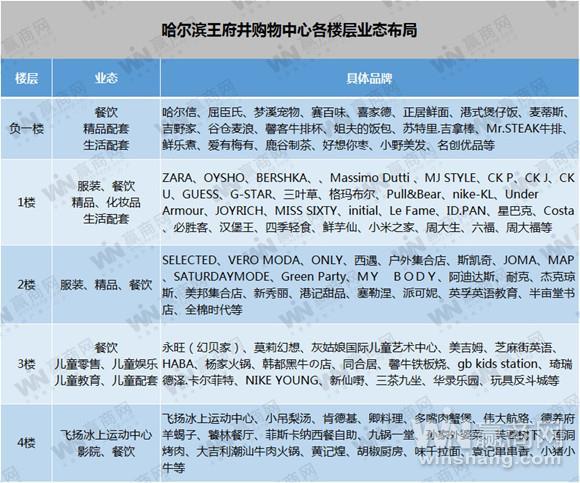哈尔滨王府井购物中心各层业态分布