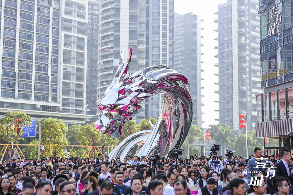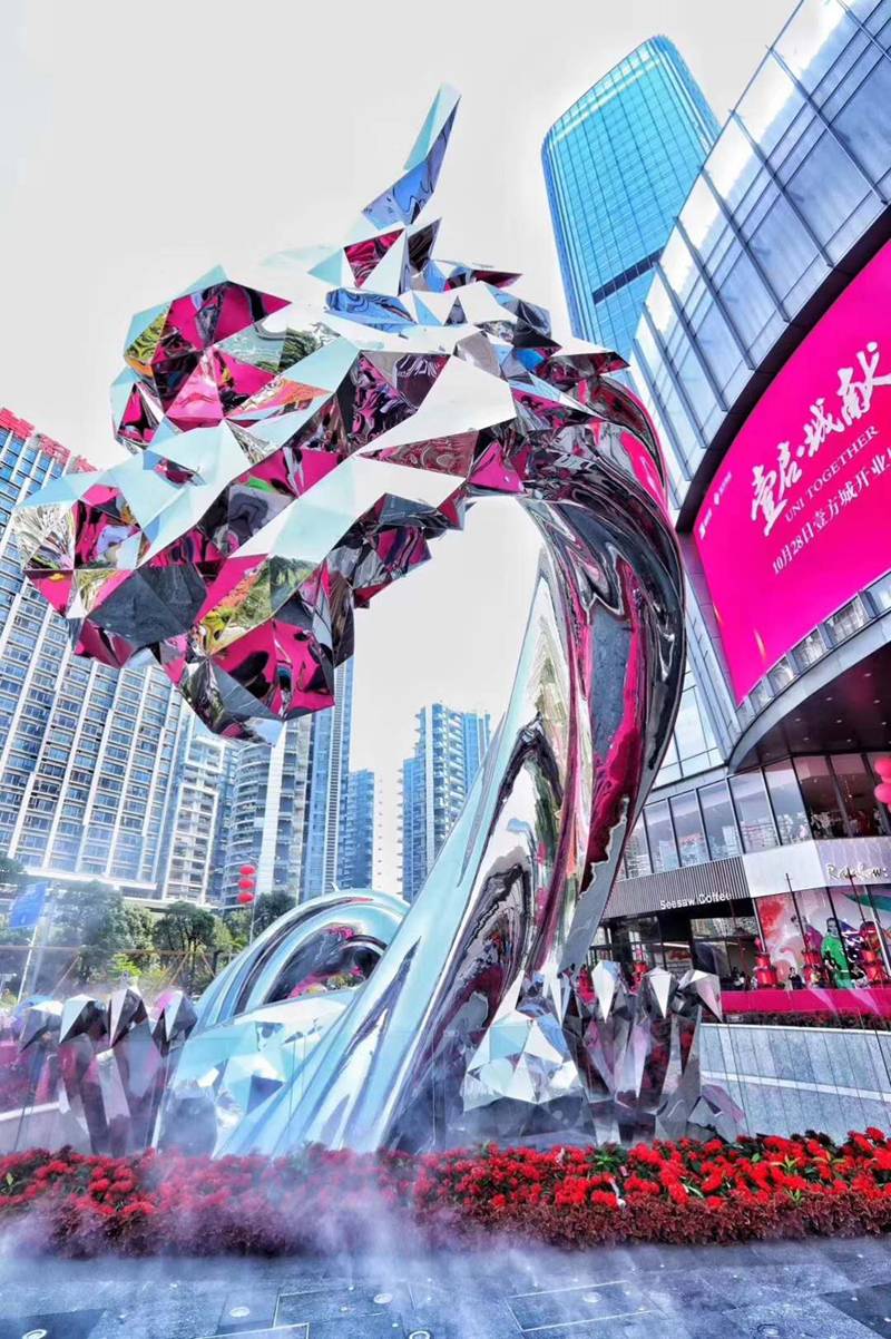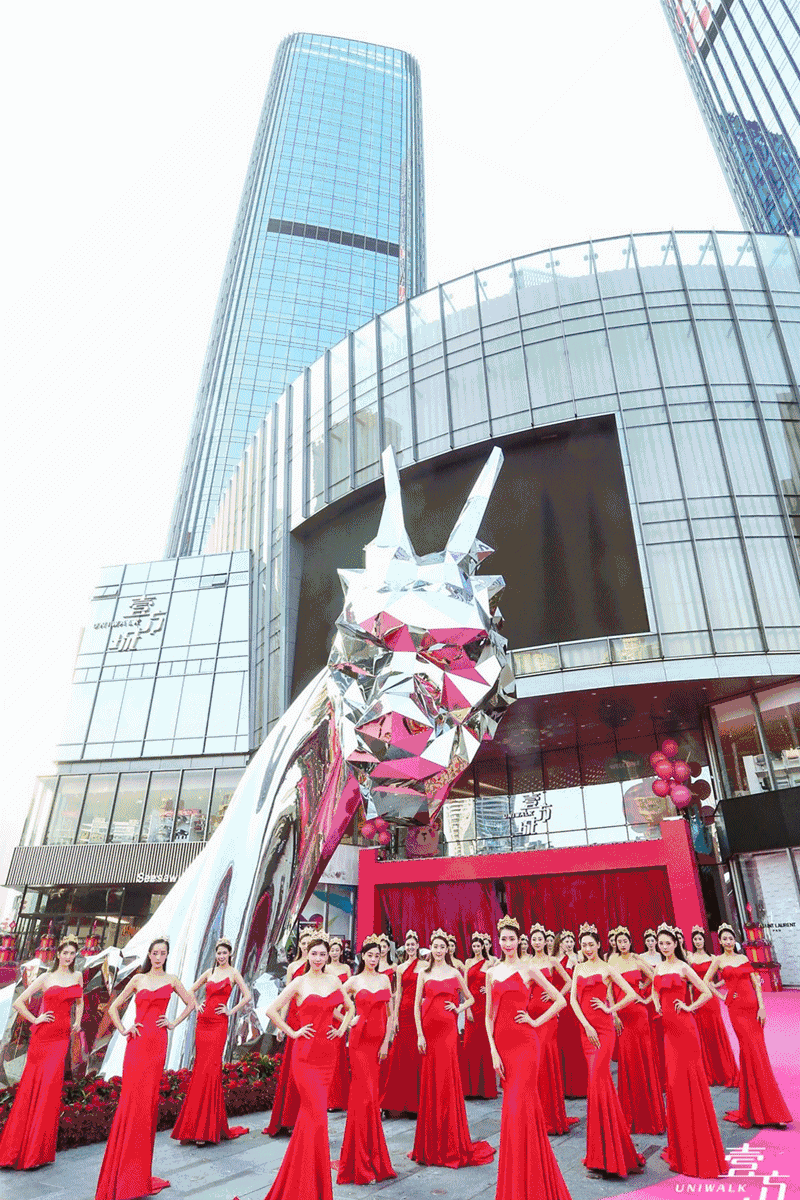 走近壹方城,迎面而来的是栩栩如生的“龙”雕塑,雄踞四方,十分抢眼。这是成都IFS爬墙大熊猫之父--Lawrence Argent(劳伦斯·爱勋)的最新作品,取名为《超然》(《Beyond Reflection》)。该作品跨越两层,从地下穿越上地面,一跃而起,栩栩如生。