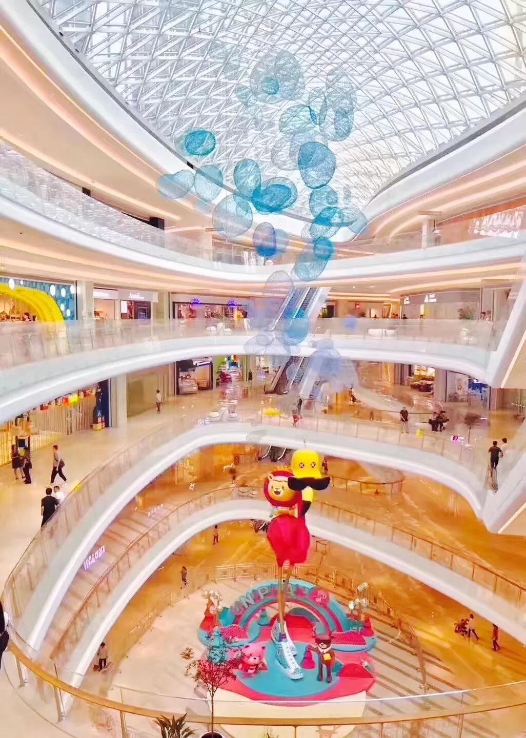 购物中心内部,超大面积的透光穹顶将自然光与购物中心相融为一体,白天,阳光尽情倾洒于项目中,黑夜,点亮的内置灯光宛若星辰挂于穹顶。45米的挑高设计让整个项目的空间更加自由空旷,层层退台式的建筑设计,使得视野更加开阔,“逛”的体验感更足。