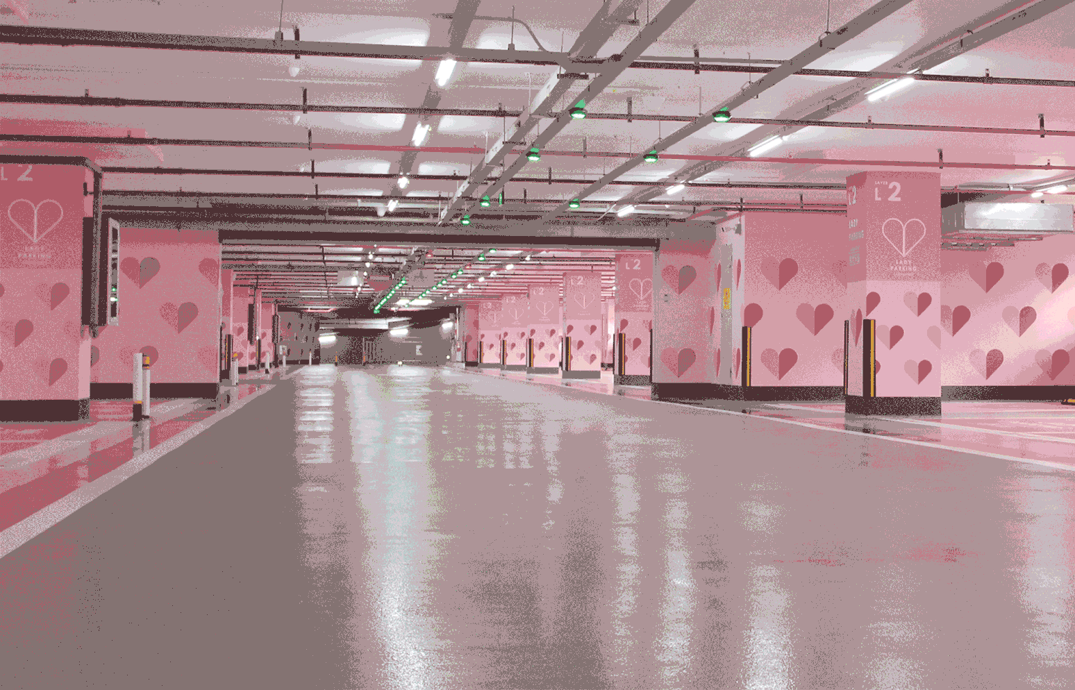 壹方城从人文情怀的角度,特地在二楼停车场设置了深圳首个女神专属停车层,全层以粉色系为主,开辟出女神车位,可以进行扫码停车,便利女性消费者。