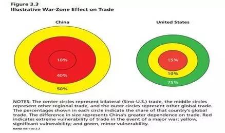 经济一体化使得中国的发展成为可能,但同时也为中国的持续发展埋下了炸弹,因为战争可以终止一切!在过去漫长的十几年中,中国已经与其邻居日本、韩国、中国台湾和越来越多地东南亚国家等形成了生产价值链,各国之间经济相互依存的。许多东亚贸易由中间产品和零部件构成,即在一国生产的输入品被运至另一国,与来自别处的部件结合,在送入市场分配系统之前被组装成最终产品。生产的一体化在促成使中国及其邻国得以繁荣的效率和生产率的同时,也容易收到战争的破坏。而在西太平洋地区的高强度和大范围的战斗,将中断中国几乎所有的贸易,中国近50%贸易将会受到影响,而美国的主要损失要比中国少很多,约15%。