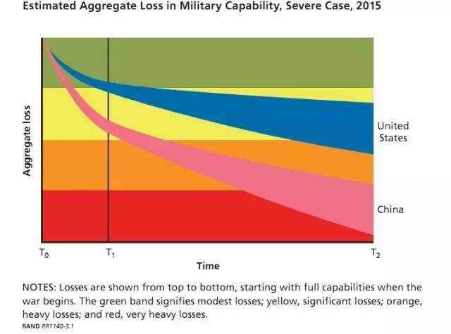 近年来中国的A2AD系统作战能力的增强,使中美实力倾向均衡,从而降低美国迅速取得战争胜利的可能性,美国的作战优势减弱。中美两军的实力、管理理念、动机和预期都指向了严重的敌对行动,意味着战争可能比预想的,或者比双方想要的,都持续得更长时间,代价更加高昂。从损失程度来看,中国面对美军时遭受的损失会减少,而美军损失将更加重。但是,今天的美军能够比中国的A2AD系统更快地削弱对方,因此,在一场激烈冲突的早期遭受重大损失时,美国的情况要好于中国。