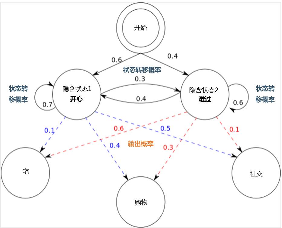 如果你正在追一个妹子,她每天都会发微信跟你闲聊当天做了什么。在简化模型下,她仅仅对三种活动感兴趣:宅居,购物和社交;同时只有两种心态:开心和难过。她选择做什么事只凭当天的心情。如果她很含蓄,不轻易袒露心扉,那你如何仅根据妹子每天做的事,判断她当天的心情状态呢?