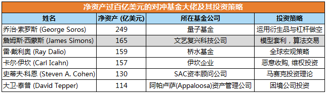表1:净资产过百亿美元的对冲基金大佬及其投资策略