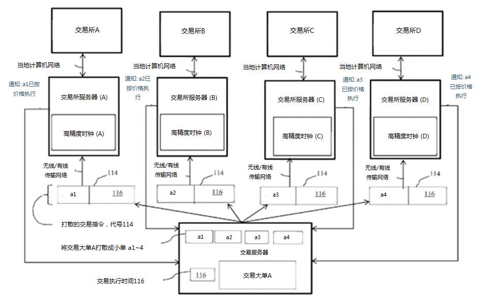 根据专利描述 (来源: 美国专利及商标局),交易大单首先被发送至一台中央服务器,该服务器会将大单打散成多个小单,连同它们精确的执行时间发送到能够提供最佳价格和最高流动性的交易所。指令信息会先传达到距离这些交易所最近的服务器,其中配备的高精度时钟可将指令执行时间同步后下单,这就扼住了高频交易 (HFT) 的命门:毕竟多数HFT公司的交易间隔是毫秒 (千分之一秒) 或者微妙 (百万分之一秒) 级,纳秒级别的时间差小到它们无法察觉,也就无法捕捉因传输延迟而导致在不同交易所的价差获利了。