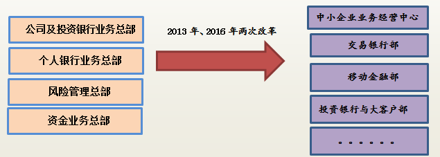 (3)2016年浦发银行设立“交易银行部”,打造“交易型银行”。事实上,浦发银行2013年就启动了扁平化组织结构改革。撤销原四大业务总部,将原有的二级部门重新整合升级为一级部门。实现组织架构的扁平化,使得一级部门快速反应和决策。