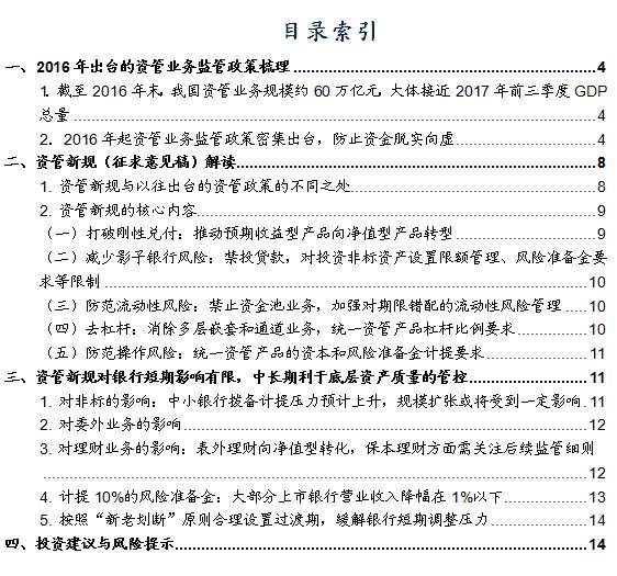 明确界定资管业务属于金融机构的表外业务,金融机构不得承诺保本保收益。同时将银行非保本理财产品纳入资管产品的范畴,统一监管。