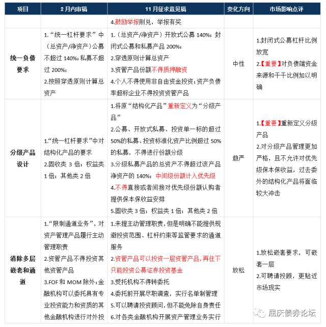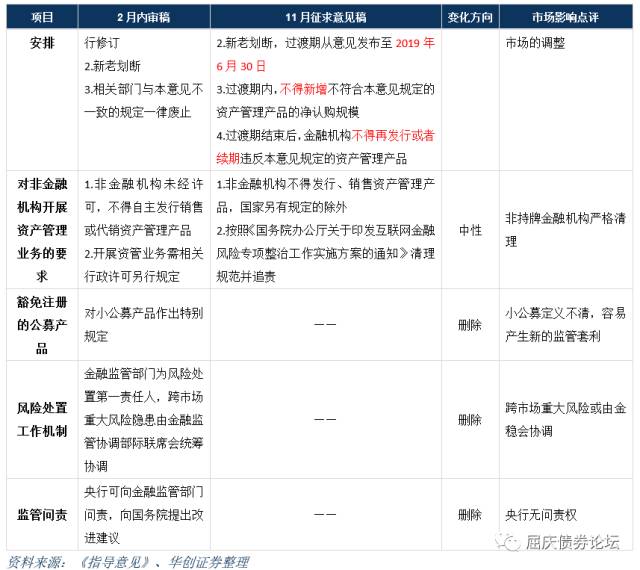《指导意见》是首个针对整体资产管理行业的框架性指导文件,每一条内容都对资管行业的生态重塑有着重要意义,但是为了便于投资者和此前的市场预期进行比较,我们将2月内审稿和11月征求意见稿进行对比,明确新版本的变化情况,并对各条规则对市场的影响进行总结概括,便于投资者把握。