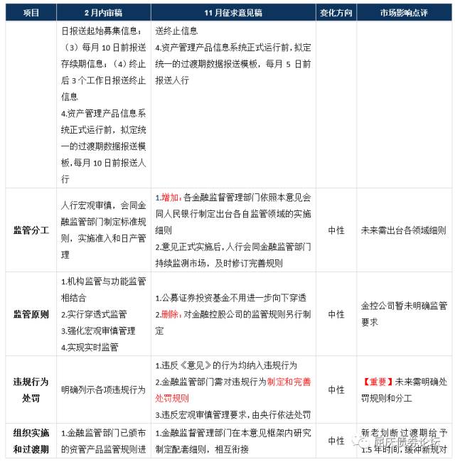 与2月征求意见稿有所不同,监管中在继续强调央行对资产管理业务实施宏观审慎管理的同时,淡化了三会的具体职责,而统称为金融监督管理部门,这体现了未来监管大方向将逐渐放弃机构监管。对资管的监管明确提到,机构监管与功能监管相结合,按照产品类型而不是机构类型实施功能监管。