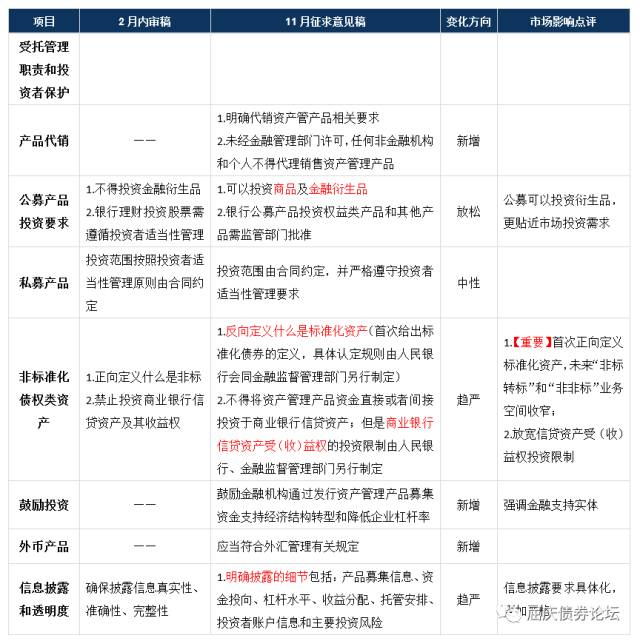 征求意见稿中关于非标资产的定义与2013年8号文相比发生了重大的变化,与明年即将实施的新金融工具会计准则(IFRS9)衔接。征求意见稿“标准化债权类资产是指在银行间市场、证券交易所市场等国务院和金融监督管理部门批准的交易市场交易的具有合理公允价值和较高流动性的债权性资产,具体认定规则由人民银行会同金融监督管理部门另行制定。其他债权类资产均为非标准化债权类资产。”;2013年8号文“非标准化债权类资产是指未在银行间市场及证券交易所市场交易的债权性资产”。