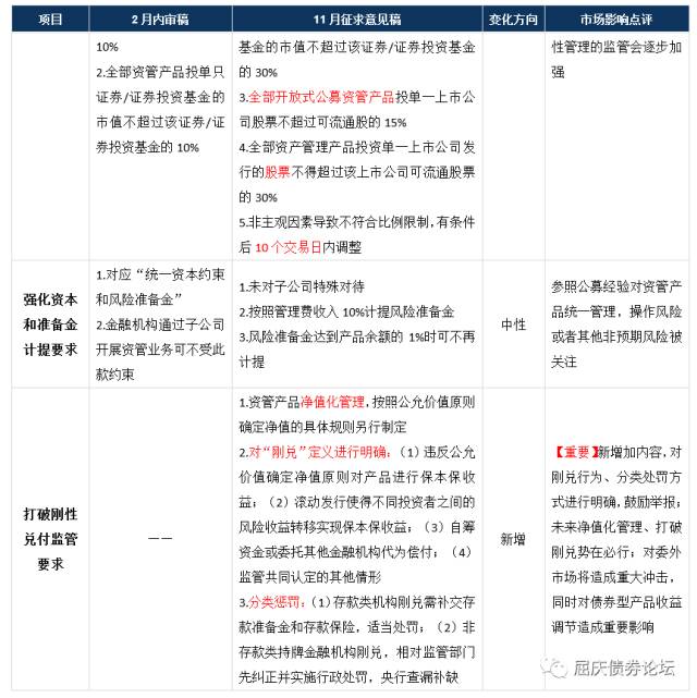 此次征求意见稿中资管产品限制投资非标资产的规定,以前出台的8号文和127号文都已经对商业银行理财资金投资非标资产这一块有过监管要求。主要规定包括:(1)每个理财产品与所投资资产(标的物)对应,做到每个产品单独管理、建账和核算;(2)商业银行理财资金投资非标准化债权资产的余额在任何试点均以理财产品余额的35%与商业银行上一年度审计报告披露总资产的4%之间孰低者为上限;(3)商业银行不得为非标准化债权资产或股权资产融资提供任何直接或间接、显性或隐性的担保或回购承诺;(4)单家商业银行对单一金融机构法人的不含结算性同业存款的同业融出资金,扣除风险权重为零的资产后的净额,不得超过该银行一级资本的50%。同业融入资金余额不得超过该银行负债总额的三分之一;(5)按照“实质重于形式”原则,根据所投资基础资产的性质,准确计量风险并计提相应资本与拨备。