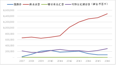 分品种结构看,商业本票、银行承兑汇票、国库券、可转让定期存单在2016年底的余额分别占票券总余额的79.00%、0.22%、4.80%、15.98%。可以看出,商业本票占据了台湾票券市场的主导地位。从变化趋势看,近五年来,商业本票的余额保持持续增长,2012年至2016年年均增速16%,而其他工具余额则没有明显的增长。