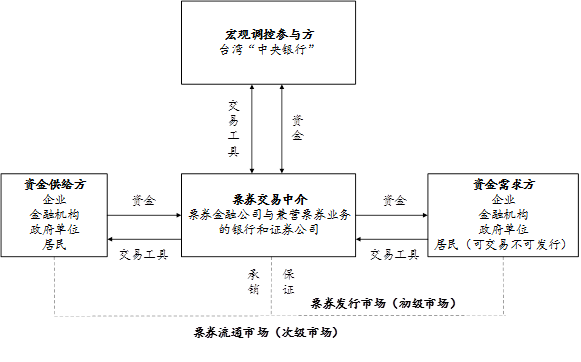 台湾票券市场参与主体较为多元:票券发行者包括企业、金融机构和政府单位,票券交易参与者包括企业、居民、金融机构、政府单位等,票券市场中介包括票券金融公司和兼营票据业务的银行、证券商等票券商,台湾“中央银行”则通过票券市场进行公开市场和再贴现操作。