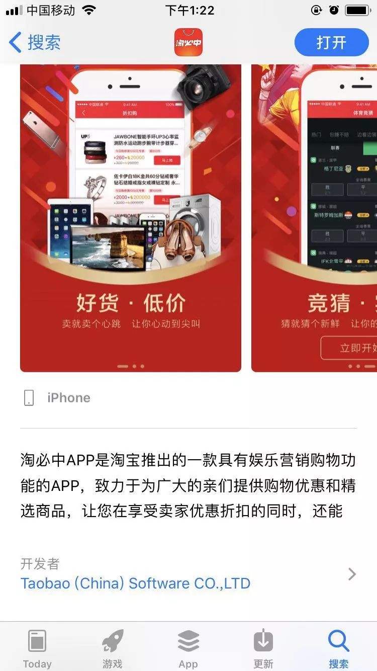 经蓝鲸TMT记者查询,这款“淘必中”APP号称“阿里巴巴旗下娱乐电商服务”。据官方介绍,这是淘宝推出的一款具有娱乐营销购物功能的APP,其开发者为淘宝(中国)软件有限公司。