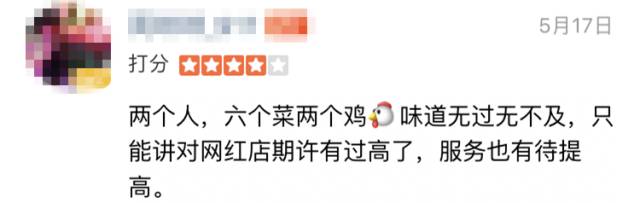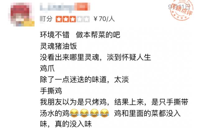 大众点评上就有网友直言:“90%的成本都花在营销上了,菜品实不想多说什么,就是把原本食材做成难以入口的黑暗料理,在卖给你两到三倍的价格而已,灵魂猪油菜饭,只有价格直击灵魂!”