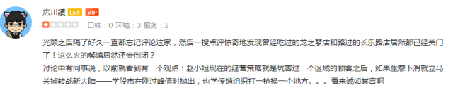 有网友称:赵小姐不等位现在的经营粗略就是坑害一个区域的顾客之后,如果生意下滑就立马关掉转战新大陆,学股市在刚过峰值时抛出,也学传销组织打一枪换一个地方。