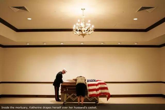 阵亡士兵遗孀凯瑟林伏在丈夫的棺椁上