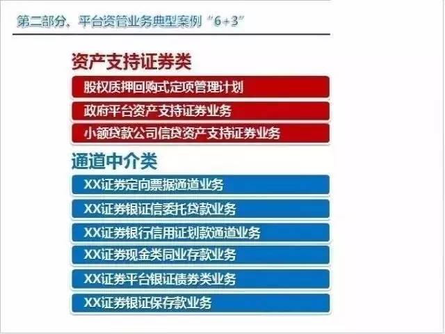 一、定向股权质押业务二、政府平台资产支持证券业务三、小贷公司信贷资产支持证券业务四、定向票据通道业务五、银证信委托贷款业务六、银行信用证划款通道业务七、现金类同业存款业务八、银证债券分销通道业务九、银证保存款类业务第一部分、新型平台资管商业模式介绍一、新型平台资管业务的发源