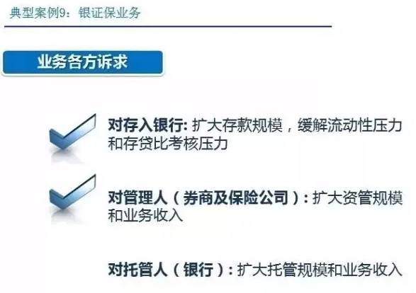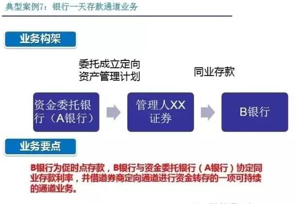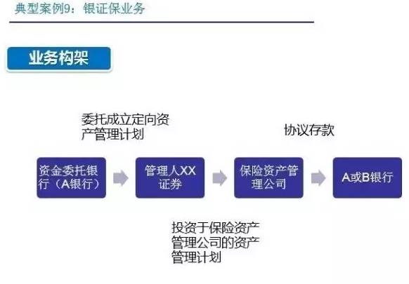·由资金委托银行(A银行)以理财资金委托XX证券成立定向资产管理计划·XX证券作为定向资产管理计划的管理人将委托资产投资于保险资产管理公司的资产管理计划·保险资产管理公司资产管理计划以保险公司名义存入B银行的协议存款,实现通道收入。·该笔存款到期后资金通过保险资产管理计划和券商定向计划回到A银行账户【版权声明:本平台致力于寻找金融行业至关重要的文章,以提高全民金融意识,促进金融交流,如涉及文章版权问题,请及时联系我们,我们会及时删除或附上稿费。联系方式:13751745460 微信号:zmjinrong】