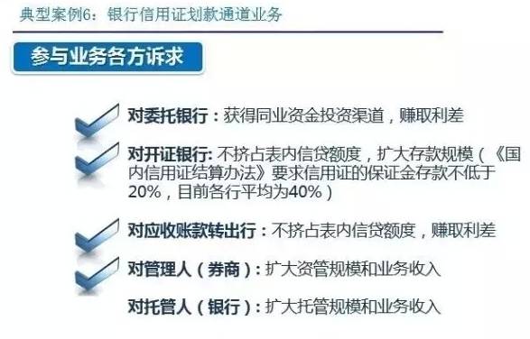 银行信用证划款通道业务是开证行为不挤占表内信贷额度、扩大存款规模,借助券商资管定向通道进行的银行间信用证划款业务,其本质是突破贷款规模的限制,扩大表外资产。