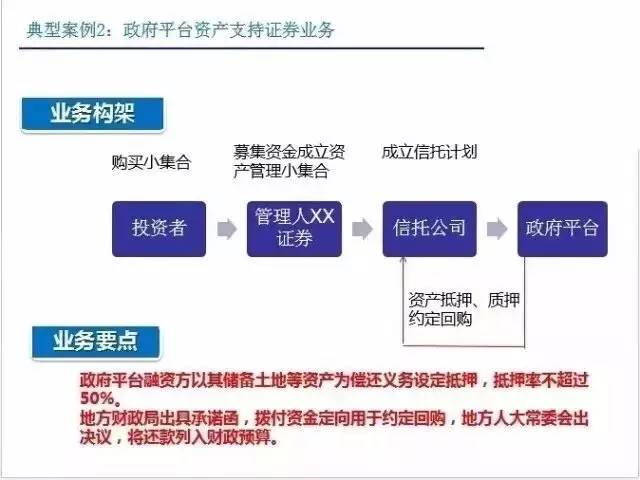 1、XX证券发起设立小集合,募集资金用于购买信托公司发起设立的信托计划。2、信托公司向政府平台受让某金融资产(债券、应收账款等),融资方承诺溢价回购并按季预付溢价金额。3、地方政府财政局出具承诺函,拨付资金定向用于约定回购,地方人大常委会出决议列入财政预算。4、融资方以其储备土地等资产做为偿还义务设定抵押,抵押率不超过50%。