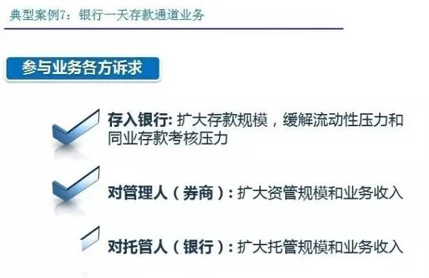 A银行在月末用资金参与一天定向计划,借道券商资管定向通道存入B银行,银行双方约定同业存款利息。第二天,定向计划结束。资金回到委托行。此业务能为银行同业时点存款考核提供便利,也促进了券商和银行之间的合作关系,有效积累资源。业务背景