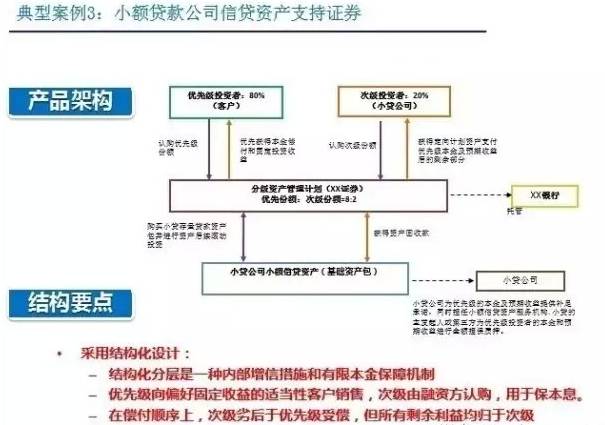 ·通过定向资产管理计划,购买小额贷款公司的信贷资产包,由信贷资产包产生的现金流作为还本付息的基础。当信贷资产包内出现违约或损失风险时,小贷公司为优先级的本金及预期收益提供补足承诺,同时担任小额信贷资产服务机构. 小贷的主发起人或第三方为优先级投资者的本金和预期收益进行全额担保质押。