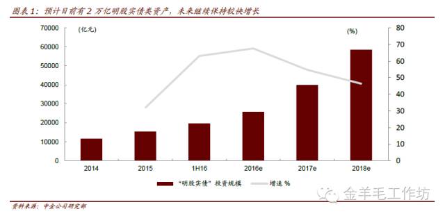 预计1H16“明股实债”类资产规模约2万亿,较年初增长25-30%。展望明后两年,我们预计仍将维持40-50%的较快增长。