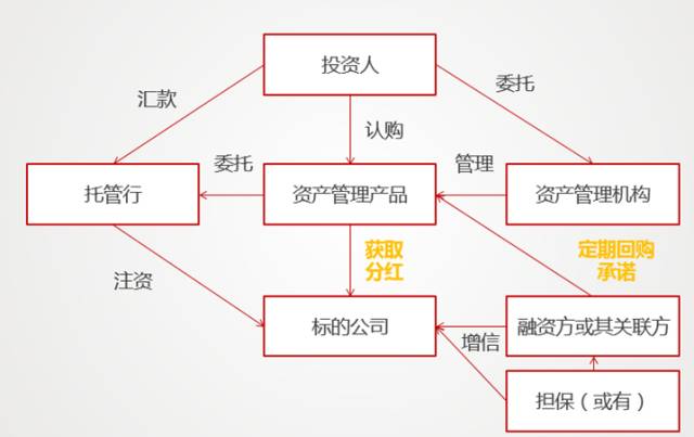 通过资产管理产品(资产管理计划或者私募基金)进行股权投资的典型结构中,投资人通过投资资产管理产品取得标的公司股权,是较为常见的股权投资结构。在此交易结构中,在资产管理产品与标的公司之间往往是以增资协议或者投资协议形式体现,不会做特殊的分红安排。
