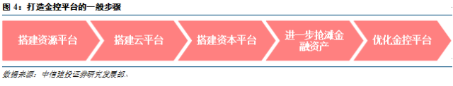 地方政府是建立金控平台的主要推手。地方金控大多为地方国有独资或控股企业。借助地方政府力量,金融控股集团能够直接控制地方核心金融企业,掌握较为齐全的金融牌照。打造地方政府金控可以大致分为以下五个步骤。