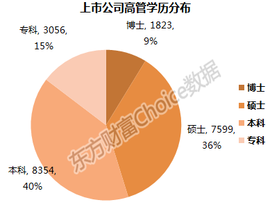 由于公开资料有限,能够统计到学历的高管共计20832位,占全部上市公司高管总数的一半左右。其中,本科学历最多,共计8354位,占比达四成;硕士学历占比36.48%,共计7599人;博士学历最少,共计1823位,占比8.75%。余下的3056位为专科学历,占比14.67%。