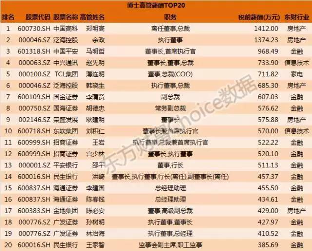 博士高管中,原中国高科总裁、中国人民大学金融学博士后郑明高居首,税前薪酬1412万元;泛海控股执行董事余政次之,2016年薪酬达1374.23万元;中国平安董事长马明哲排名第三,税前薪酬968.49万元。
