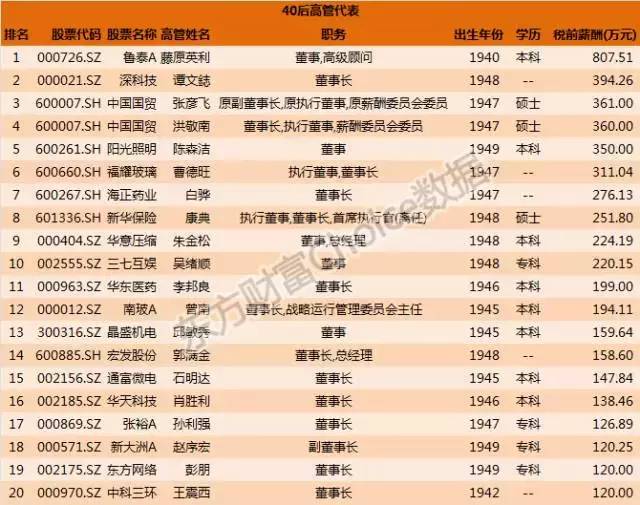 40后高管大多已年近古稀,其中,鲁泰A日籍高管——享有“世界格子布大王”美誉的藤原英利现年77岁,以807.51万元的税前薪酬,高居“40后高管薪酬榜”之首;毕业于牛津大学的深科技董事长谭文鋕排名第二,2016年税前薪酬为394.26万元。中国国贸原董事张彦飞,以及现董事长洪敬南,分别以361万元、360万元的薪酬,排入前四。此外,阳光照明董事陈森洁位列第五,2016年税前薪酬为350万元。据悉,陈森洁家族2016年以48亿元的财富进入《胡润百富榜》,排名第846位。