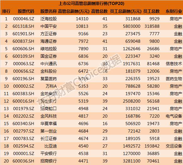 根据东方财富Choice数据统计,2016年,泛海控股高管总薪酬达1.43亿元,位列沪深两市3204家上市公司之首;中国平安次之,高管总薪酬为1.08亿元。其后为方正证券及海通证券,高管总薪酬分别为9166万元及7972万元。