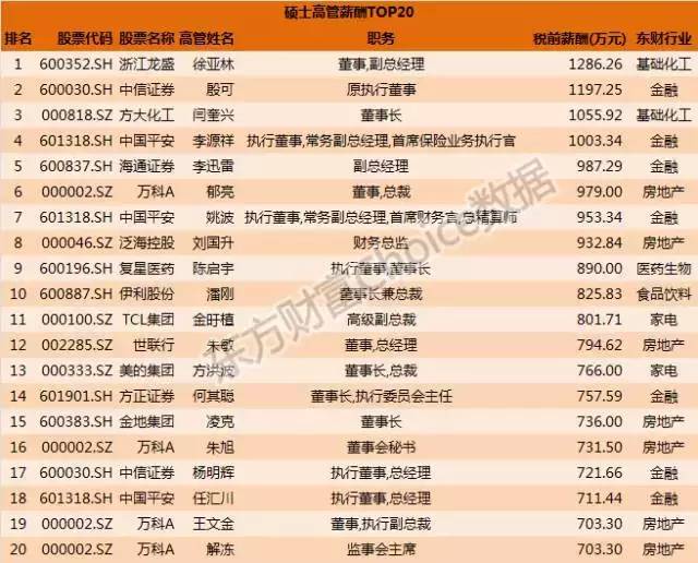 硕士高管中,浙江龙盛董事徐亚林以1286.26万元,位列榜首;中信证券原执行董事殷可次之,2016年薪酬1197.25万元。其后为方大化工董事长闫奎兴,2016年税前薪酬为1055.92万元。