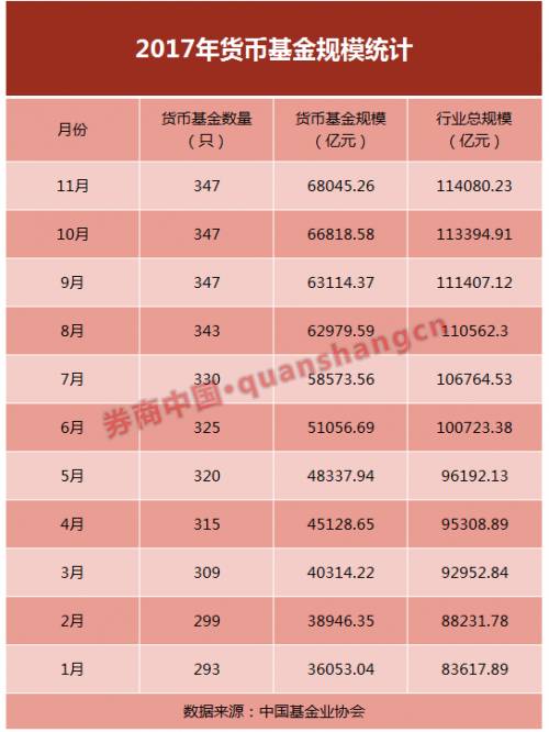对此,中国基金业协会表示,货币市场基金占比较大,存在结构不平衡问题。根据中国证券投资基金业协会的数据,截至2017年11月底,货币基金总规模为6.80万亿元,比10月底增加1226.68亿元,11月底货币基金规模占基金总规模的比例达到59.6%。而年初,我国货币基金规模为3.61万亿元。