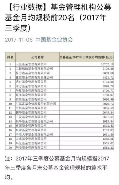 中国基金业协会披露的2017年三季度数据,包含货币基金规模在内的公募基金月均规模前20名当中,天弘以1.675万亿元月均规模的绝对优势,领先第二名工银瑞信,后者月均规模7129亿元。而非货币公墓基金月均规模排名中,第一名的工银瑞信三季度非货币月均规模为2483.20亿元,与第二三名差距不大,在100亿元上下,而天弘基金连前二十名都并未进入。