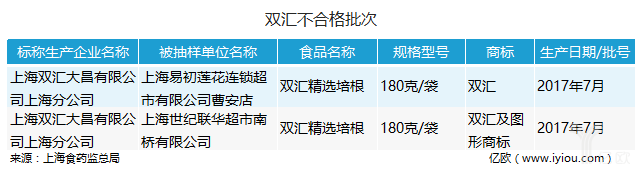 11月22日,上海市食药监局公布11批次不合格食品。其中,2批次双汇精选培根菌落总数超标。产品为上海双汇大昌有限公司上海分公司生产,分别由上海易初莲花连锁超市有限公司曹安店、上海世纪联华超市南桥有限公司销售。