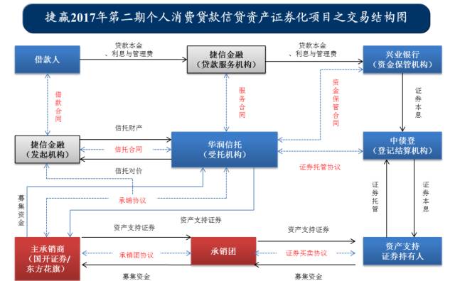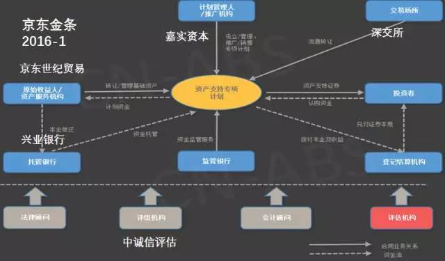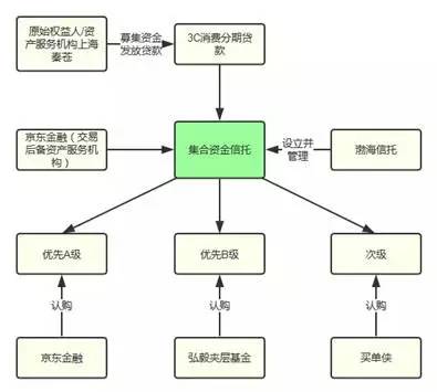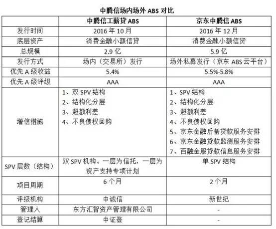 2016年年底,京东金融“资产证券化云平台”与消费金融公司中腾信推出的“京东•中腾信微贷资产证券化产品”在京东ABS云平台发行,这是国内首次引入双资产服务机构的资产证券化产品。发行规模5.89亿元,优先A级发行利率为5.5%-5.8%。京东金融方以自有资金出资5亿元认购结构化信托优先级,用于向中腾信推荐的借款人发放小额消费金融借款形成基础资产,并持有部分夹层级信托受益权。通过外部评级机构将持有的优先级信托份额细分为优先A、优先B、优先C级。