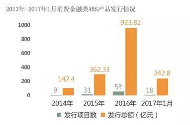从Wind口径的消费金融ABS的统计数据来看,2014年银行间市场发行1只,额度81.09亿元;交易所市场发行8只,总额度61.31亿; 2015年银行间市场发行5只,额度218.71亿元;交易所市场发行26只,额度143.62亿,总规模同比大幅扩张。2016年,银行间市场发行8只,总计200.32亿元;交易所市场发行45只,额度723.5亿元。2017年至今消费信贷ABS占交易所企业ABS发行量37.6%,已成为交易所ABS市场第一大产品。
