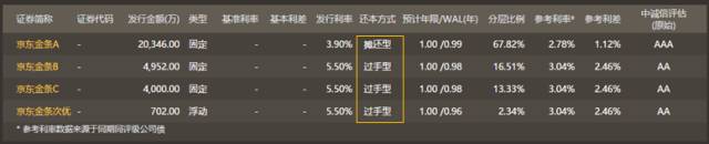 京东白条和京东的结构化分级策略,京东白条的结构化分级为三层,还本方式为过手型,京东金条的结构化总体分为优先级和次级,其中优先级分为三档包括京东金条A,京东金条B,京东金条C,次级京东金条次优,除了京东金条A为摊还型,其他类型均为过手型,也就是说除了京东金条A可以按照预定的还本计划偿还本金,其他级别均按照规定顺序按比例分配给投资者,分层比例结构为:67.82%,16.51%,13.33%,2.34%。