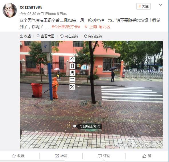 微博 @xdzzml1985:这个天气清洁工很辛苦....刚扫完,风一吹树叶掉一地。请不要随手扔垃圾!我做到了,你呢?