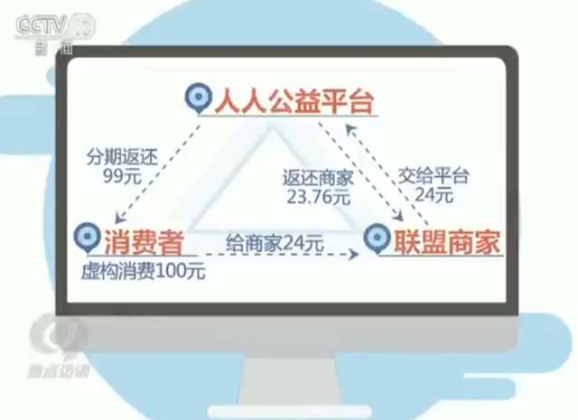 例如,虚构100元消费,商家用消费者账户给商家账户24元,再通过商户账号将这24元交给人人公益平台,商户就能分期收到消费者的返利99元,获利超了近4倍,而且还可以分期返还近24元的商家让利款项。