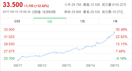 上周五(9月15日),在A股H股房地产板块集体发力的情况下,在香港上市的房地产商融创中国的股价在当日的涨幅达到了12.4%,至每股33.5港元,创下了历史新高。