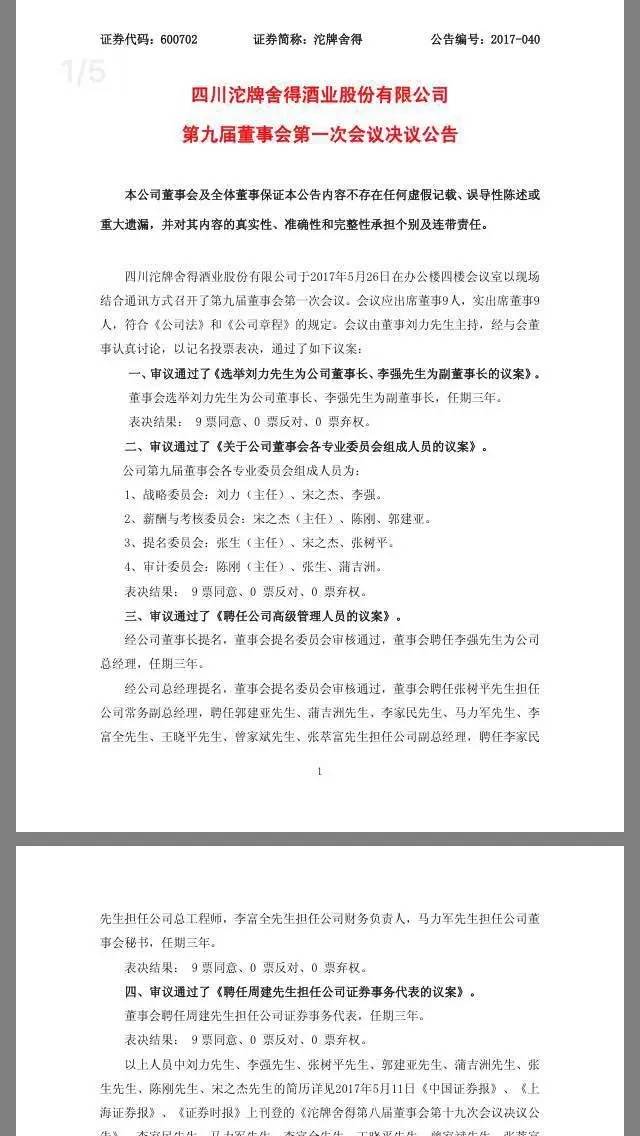 5月26日,沱牌舍得第九届董事会第一次会议召开。