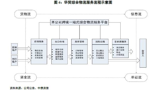 在综合物流同类型供应链企业中,因涉及服务领域及客户需求不同,服务链条亦不同;同时根据企业自身规模、业务能力,其所提供服务也存在差异。以华贸物流为例,相较于传统物流企业,华贸物流在仓储管理、库内操作、快递配送及物流运输等基础服务上衍生出供应链板块,为客户提供综合供应链式物流一体化服务,在国内和香港设立了34个业务和服务网络,在全球150多个主要港口和集散城市与当地同类企业建立了长期合作关系。在业务运行中,华贸物流按照业务类型和客户需求,通过货物流、信息流、单证流、资金流为客户提供储存、理货、贴标、贵重物品安保及资金结算等一系列附加增值服务,属于典型的轻资产供应链物流服务企业。