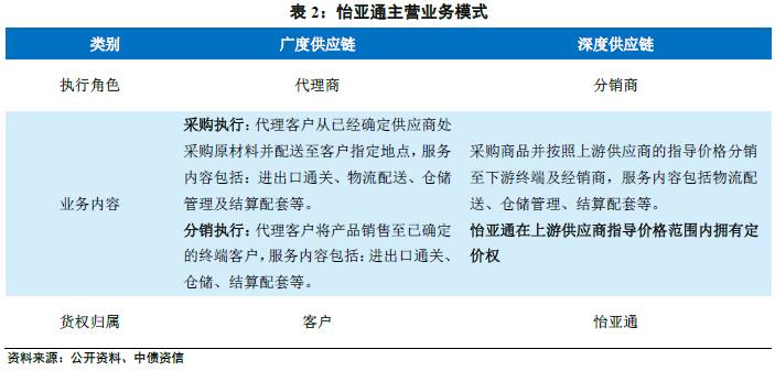 怡亚通主要业务为广度和深度供应链业务,其中广度供应链业务中,怡亚通以代理商的角色,进行采购执行和分销执行业务,深度供应链则以分销商的角色采购并自定价格分销至下游终端,同时提供物流配送和仓储等系列服务。