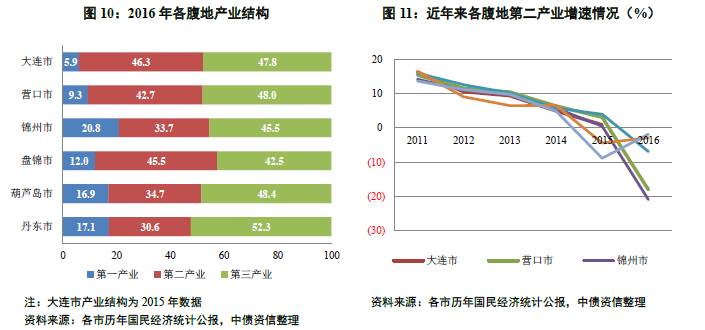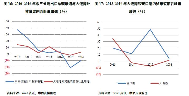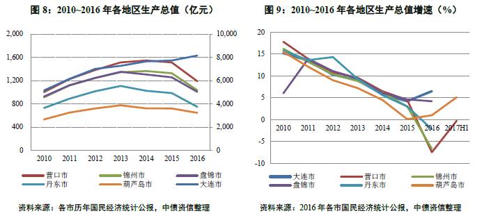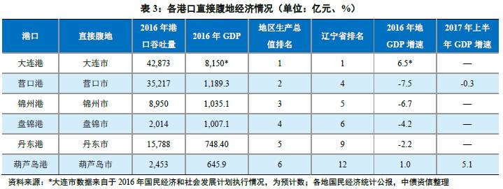 从经济增速看,东北地区作为老工业基地,近年来受经济结构调整和过剩产能淘汰影响,区域内经济下行压力大,除大连市外各直接经济腹地经济增速均下滑明显,2016年营口市、锦州市、盘锦市和丹东市经济均出现负增长,2017年上半年,全国经济有所企稳,辽宁省经济虽有所回升,但增速仍处全国较低水平,且部分主要城市经济仍为负增长。