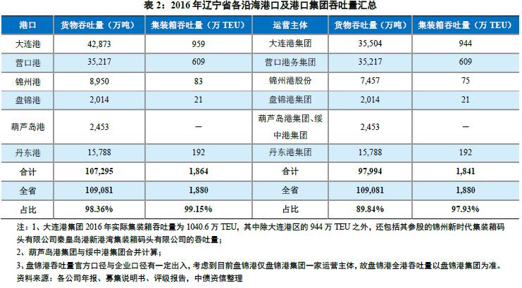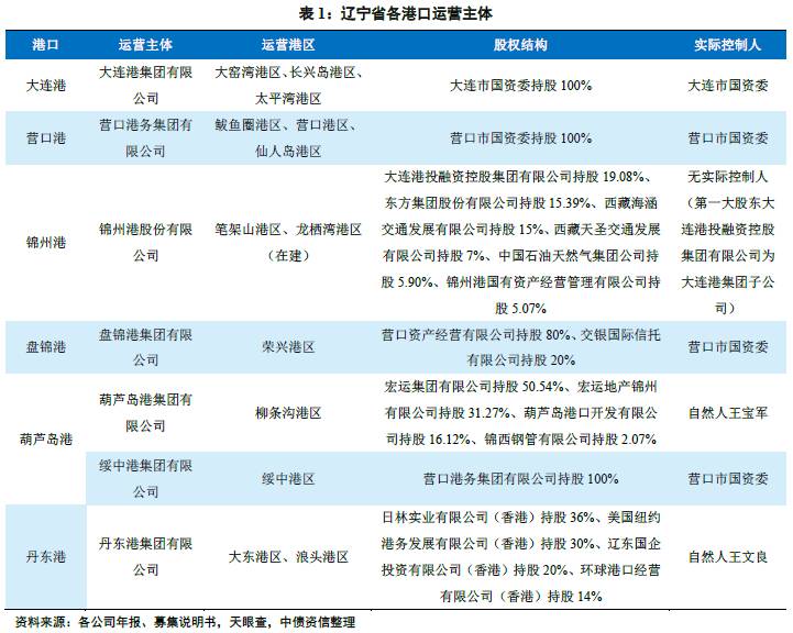 辽宁省港口主要运营商为大连港集团、营口港务集团、丹东港集团及锦州港股份。其中,锦州港股份为A股上市公司,其第一大股东大连港投控为大连港集团子公司,持股比例19.08%;盘锦港集团原为营口港务集团全资子公司,虽然2014年营口港务集团将其持有的盘锦港集团股份全部转让给营口市资产经营公司,但盘锦港仍归属营口港务集团统一管理运营;葫芦岛港包括柳条沟港区和绥中港区两个规模化港区,规模均很小,分别由葫芦岛港集团和绥中港集团运营,其中前者第一大股东为民营企业宏运集团,后者为营口港务集团全资子公司;丹东港运营主体丹东港集团为中外合资企业,其第一大股东为民营企业日林实业有限公司(香港)。