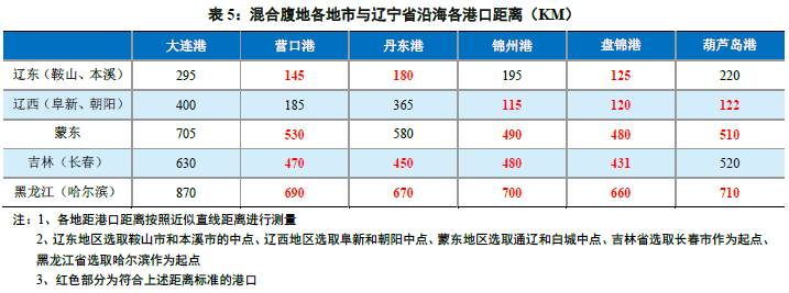 我们首先依据各地市距各港口距离对港口混合腹地进行了划分:港口内各类散杂货装卸费率在十几元到几十元不等,但相同货种装卸费率基本差别不大,从历史上港口间价格战经验看,若混合腹地对特定港口需求刚性不强,则5元/吨左右一般为货主对港口间散杂货费率差异的可接受值。以陆路运费最低的铁路测算,沈阳铁路局干散货运输费率约0.10~0.15元/吨公里,则混合腹地可选择港口运距差异范围一般为50公里左右。以各地与其最近港口之间的距离+50公里左右的范围作为港口对应混合腹地的初步判断标准。